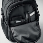 Plecak na laptopa 15 cali z poliestru 600D RPET łączy w sobie zaawansowaną funkcjonalność i zaangażowanie ekologiczne, oferując trzy duże, zapinane na zamek komory zewnętrzne, które są w pełni wyściełane i wyposażone w liczne kieszenie wewnętrzne dla optymalnej organizacji przestrzeni. Dodatkowo, dwie boczne kieszenie z siateczki zwiększają dostępność i wygodę przechowywania drobniejszych przedmiotów czy butelek z napojami. Regulowane szelki i wyściełana siatką część tylna z przepływem powietrza zapewniają maksymalny komfort noszenia, nawet przez długie godziny, a uchwyt na walizkę z tyłu stanowi praktyczne rozwiązanie dla podróżujących. Wykonanie z recyklingowanego poliestru 600D RPET nie tylko świadczy o trwałości i odporności plecaka, ale także podkreśla ekologiczne wartości marki, co czyni go idealnym gadżetem reklamowym dla firm świadomych swojego wpływu na środowisko i pragnących promować zrównoważony rozwój poprzez praktyczne i stylowe produkty.