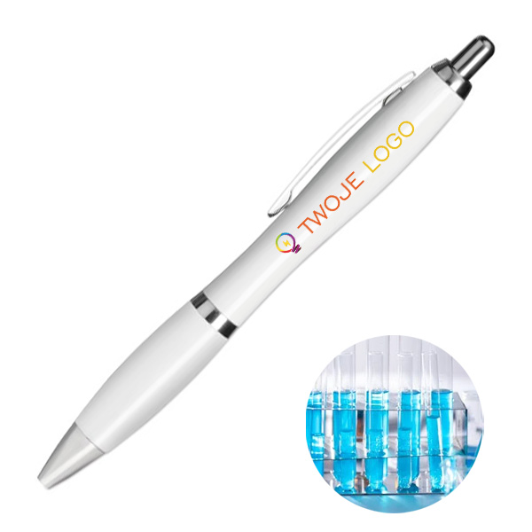 Długopis z przyciskiem z ABS z tubą antybakteryjną. Zawiera specjalny dodatek (nanosrebro), który zapobiega kolonizacji bakterii na powierzchni. ISO 22196. Niebieski tusz.