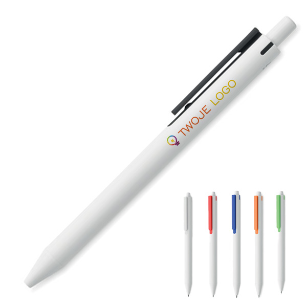 Przyciskany długopis z korpusem wykonanym z kartonów po mleku pochodzących z recyklingu i z elementami z PLA (w 100% biodegradowalnej kukurydzy). Niebieski tusz.