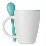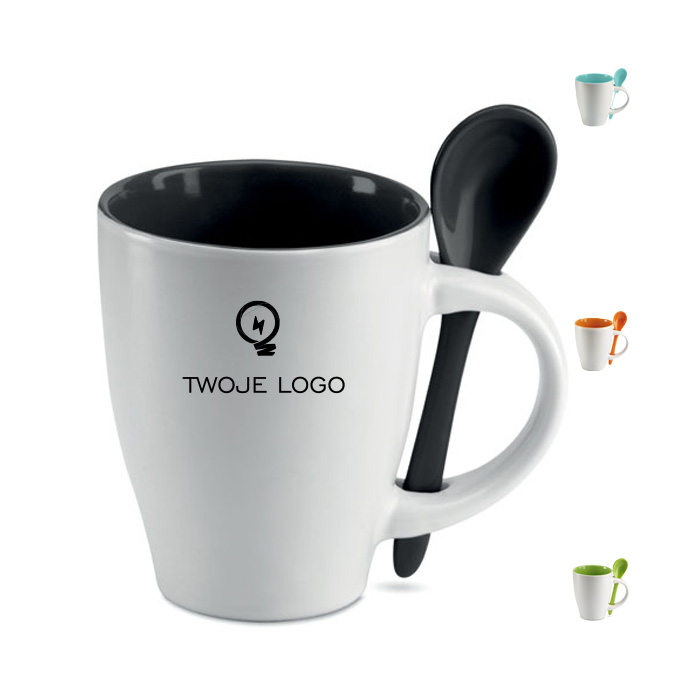 Dwukolorowy ceramiczny kubek do kawy o pojemności 250 ml, w komplecie z łyżeczką, która idealnie komponuje się kolorem z wnętrzem kubka, to elegancki i funkcjonalny dodatek do każdej kuchni czy biura. Prezentowany w indywidualnym pudełku o wymiarach 11,5 x 10,5 x 9,3 cm, zestaw ten stanowi doskonały pomysł na prezent lub efektywny gadżet reklamowy. Dwukolorowe wykończenie nie tylko nadaje kubkowi wyjątkowy charakter, ale także pozwala na łatwe dopasowanie do różnych stylów i preferencji. Łyżeczka, będąca nie tylko praktycznym dodatkiem, ale także elementem podkreślającym estetykę zestawu, dodaje całości spójności i uroku. Kubek ten, dzięki swojemu klasycznemu designowi i praktyczności, jest idealny do codziennego użytku, umożliwiając cieszenie się ulubioną kawą czy herbatą w stylowy sposób. Możliwość personalizacji, na przykład poprzez naniesienie logo firmy na kubek, czyni go atrakcyjnym wyborem dla firm szukających oryginalnych i użytecznych gadżetów reklamowych, które będą długo służyć ich klientom lub pracownikom, jednocześnie promując markę.