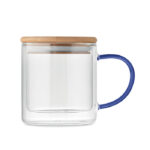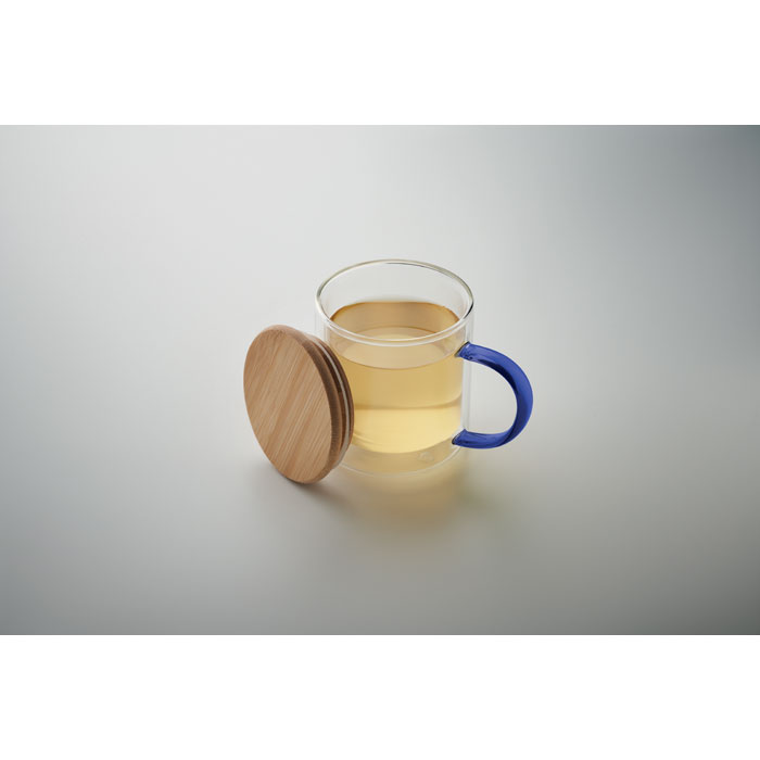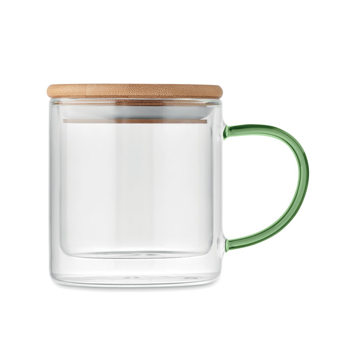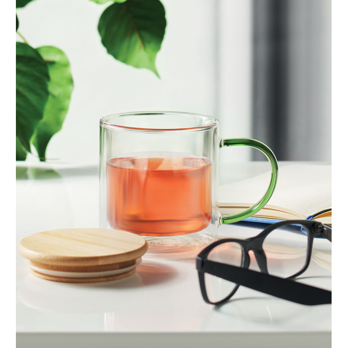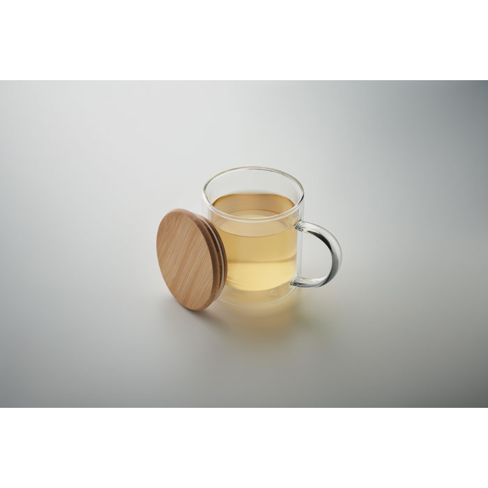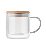 Kubek z podwójnymi ściankami ze szkła borokrzemowego z uchwytem i bambusową pokrywką. Pojemność: 300 ml.