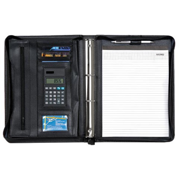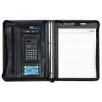 Teczka Konferencyjna na Zamek Vicenza, wykonana z czarnej ekoskóry, to elegancki i praktyczny gadżet reklamowy, idealny dla świata biznesu. Teczka ta, z poręcznym uchwytem, jest wyposażona w kalkulator, wkład papierowy A4, metalowy ring, kieszonkę z zamkiem oraz uchwyt na długopis, co czyni ją niezwykle funkcjonalną. Dodatkowo, posiada kieszonki na wizytówki oraz przegródki na dokumenty, co zapewnia doskonałą organizację materiałów konferencyjnych i biznesowych. Kalkulator, zasilany 1 baterią AG10 (dołączoną do produktu), zwiększa jej funkcjonalność. Możliwość umieszczenia logo firmy na teczce czyni ją doskonałym narzędziem promocyjnym, które łączy elegancję, praktyczność i profesjonalizm. Teczka Vicenza jest idealna jako upominek dla klientów i pracowników, podkreślając zaangażowanie firmy w oferowanie wysokiej jakości, funkcjonalnych i stylowych gadżetów reklamowych. Długopis nie jest dołączony.