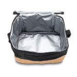 Torba termoizolacyjna na lunch Oradea w kolorze czarnym, z eleganckim korkowym wykończeniem, to świetny gadżet reklamowy dla firm poszukujących praktycznych i atrakcyjnych produktów promocyjnych. Wewnętrzny materiał PEVA torby zapewnia utrzymanie stałej temperatury żywności i napojów poza domem, co jest idealne dla osób przenoszących posiłki do pracy, na plażę, w podróż czy na piknik. Torba jest nie tylko funkcjonalna, ale także stylowa dzięki unikalnemu wykończeniu z korka. Wyposażona w regulowany pasek na ramię, torba ta jest wygodna w noszeniu, a boczna zewnętrzna kieszonka oraz zamek zwiększają jej praktyczność i bezpieczeństwo użytkowania. Logo firmy umieszczone na torbie nie tylko podnosi jej wartość jako narzędzia marketingowego, ale także promuje markę jako świadomą potrzeb swoich klientów i pracowników.