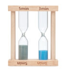 Zestaw 2 zegarów piaskowych w drewnianej konstrukcji, z klepsydrami odmierzającymi czas około 3 i 5 minut, to elegancki i funkcjonalny gadżet reklamowy, który łączy tradycyjne metody mierzenia czasu z naturalną estetyką. Idealny dla firm pragnących promować wartości takie jak cierpliwość, skupienie i świadome zarządzanie czasem. Dzięki swojemu klasycznemu designowi, zestaw ten doskonale wpisuje się w różnorodne przestrzenie, od domowych biurek po profesjonalne środowiska pracy. Możliwość personalizacji, np. poprzez grawerowanie logo na drewnianej podstawie, oferuje wyjątkową okazję do eksponowania marki w subtelny, ale wyraźny sposób. Taki zestaw zegarów piaskowych nie tylko jest praktycznym narzędziem pomagającym w organizacji czasu, ale także stanowi dekoracyjny element wnętrza, który z pewnością przyciągnie uwagę i zostanie doceniony przez odbiorców ceniących oryginalność i ponadczasową elegancję.