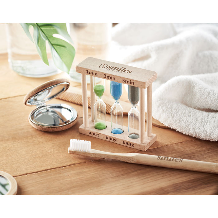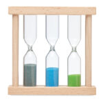 Drewniany potrójny zegar piaskowy z zestawem 3 różnych klepsydram (ok. 1, 3 i 5 minut) to unikatowy i funkcjonalny gadżet reklamowy, który łączy tradycyjne podejście do mierzenia czasu z estetycznym wyglądem. Jest to doskonała propozycja dla firm pragnących podkreślić wartości takie jak precyzja, cierpliwość i zrozumienie dla naturalnego przepływu czasu. Każda z klepsydram pozwala na odmierzenie innego odcinka czasu, co może być przydatne w wielu sytuacjach, np. podczas krótkich przerw na relaks, ćwiczeń oddechowych lub jako pomoc w zarządzaniu czasem pracy. Drewniana konstrukcja nie tylko nadaje zegarowi elegancji i ciepła, ale także jest trwała i ekologiczna. Możliwość personalizacji, na przykład poprzez grawerowanie logo firmy na drewnianej podstawie, czyni go atrakcyjnym narzędziem marketingowym, które może skutecznie promować markę wśród klientów i partnerów biznesowych ceniących oryginalność i przywiązujących wagę do jakości. Drewniany potrójny zegar piaskowy to nie tylko praktyczny upominek, ale także elegancki element dekoracyjny, który z pewnością znajdzie swoje miejsce w domu lub biurze, przypominając o marce za każdym razem, gdy zostanie użyty.
