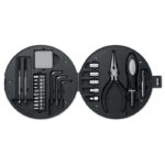 Zestaw narzędzi 25-częściowy, zapakowany w unikatowe opakowanie w kształcie opony, zawierający przedłużacz, śrubokręt nasadowy, kombinerki, 5 nasadek, 3 klucze sześciokątne, 10 końcówek, 2 śrubokręty precyzyjne oraz taśmę, jest atrakcyjnym gadżetem reklamowym dla firm z branży motoryzacyjnej, budowlanej czy DIY, pragnących zaoferować swoim klientom i pracownikom funkcjonalny i oryginalny prezent. Opakowanie w kształcie opony nie tylko przyciąga uwagę i wyróżnia zestaw na tle innych gadżetów reklamowych, ale także stanowi znakomite tło do umieszczenia logo firmy, co może znacząco zwiększyć jej rozpoznawalność. Zestaw narzędzi jest praktycznym rozwiązaniem dla każdego, kto potrzebuje kompletnego zestawu narzędzi do drobnych napraw w domu, w garażu czy podczas podróży, oferując szeroki zakres funkcji i możliwości. Personalizacja tego zestawu poprzez nadruk lub grawerowanie logo firmy czyni go nie tylko użytecznym narzędziem, ale również skutecznym nośnikiem marki, który zwiększa świadomość i lojalność wobec firmy.