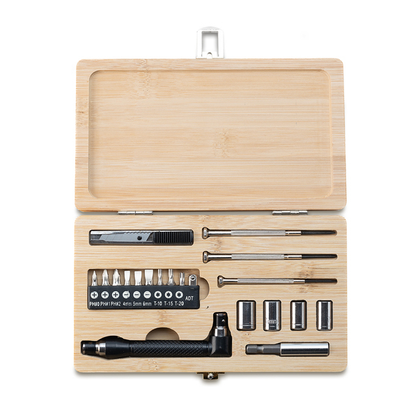 Zestaw narzędzi Pattaya to elegancki i praktyczny gadżet reklamowy, idealny dla firm poszukujących stylowych i funkcjonalnych produktów promocyjnych. Umieszczony w stylowym pudełku wykonanym z bambusa, zestaw wyróżnia się zarówno wysoką jakością wykonania, jak i unikalnym designem. W skład zestawu wchodzi szeroka gama narzędzi, które sprawdzą się w wielu sytuacjach: zestaw bitów 1/4″, w tym 3 phillips (krzyżowe), 3 płaskie, 3 torx, 1 sq (kwadratowy); zestaw 4 kluczy nasadowych; zestaw 3 wkrętaków precyzyjnych; nóż do tapet; uchwyt do kluczy z grzechotką; oraz adapter do bitów 1/4″. Zestaw narzędzi Pattaya jest doskonałym wyborem dla majsterkowiczów, profesjonalistów, a także jako upominek dla klientów biznesowych i pracowników. Możliwość umieszczenia logo firmy na pudełku bambusowym zwiększa rozpoznawalność marki i podkreśla jej zaangażowanie w dostarczanie praktycznych i estetycznych rozwiązań.